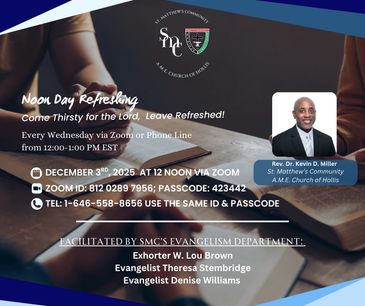 St. Matthew’s COMMUNITY AME Church of Hollis! For more than 65 years, we have been strengthening our community with the lifesaving message of Jesus Christ. It is our goal to not just preach the good news of Jesus Christ, but to live this good news of Jesus Christ through service and activism. If you do not have a community to call your Christian family, we invite you ask God and consider joining our welcoming family of believers. Explore our website and social media channels and learn more about our love for Christ as we work to “Transform Communities for God’s Glory”.